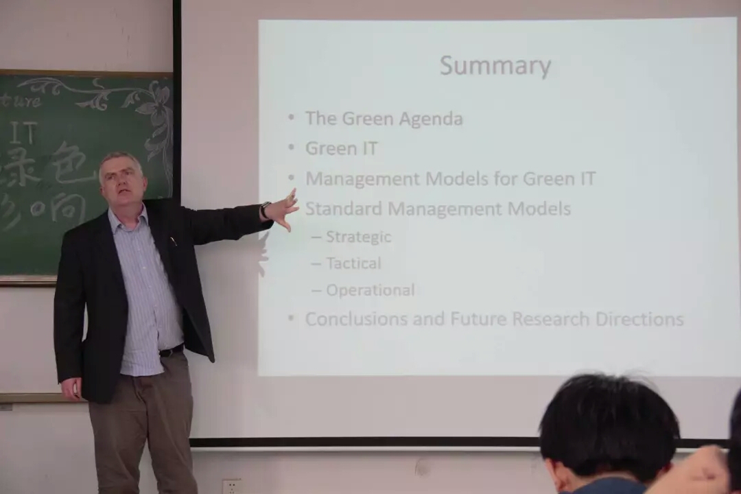 演讲开始时,刘晓玲老师为在场学生做了简要介绍,主讲人William Campell博士就绿色IT发表了对其发展、影响因素等方面的讲述,并且就这个问题提及了各公司产业的发展思想、决策方式以及公司与能源、消费者等对绿色IT发展的影响,而角色思想,定位研讨等阐述更是让听众加深了对IT的认知。马南老师也就专业问题向在场学生介绍了伯明翰城市大学,以及一些专业学习的有益建议。
