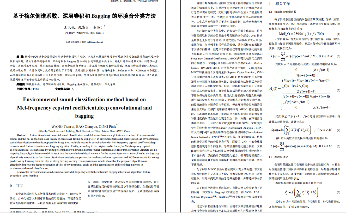 2019年8月,Android创新实验室16级学生负责人王天锐(物联网工程专业)和鲍骞月(数字媒体技术专业)同学在实验室秦品乐老师的指导下,在中文核心期刊《计算机应用》(中国计算机学会评选为优秀期刊)发表一篇学术论文《基于梅尔倒谱系数、深层卷积和Bagging的环境音分类方法》,已被中国知网(CNKI)检索。该文针对传统环境音分类模型对环境音特征提取不充分,以及卷积神经网络用于环境音分类时全连接层易造成过拟合现象的问题,提出了梅尔倒谱系数、深层卷积和Bagging算法相结合的环境音分类方法。实验结果表明,所提算法能够有效提高对环境音频的特征提取能力,以及提高深层网络在环境音分类上的抗过拟合能力。本论文是太阳城集团