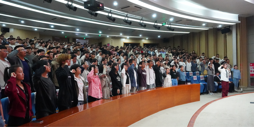 首先,本科生新生代表梁宛心和研究生新生代表郭钰婕依次上台发言,她们的发言充满了对未来学习生活的向往与期待,表达了不断超越自我的决心和勇气。随后,教师代表兼新生班主任孙福盛老师致辞,他勉励新生努力拼搏,并代表全体教师庄严承诺:将秉持爱岗敬业、为人师表的精神,真诚关爱每一位学生。在校生代表段金印结合自身学习与生活经验,鼓励他们明确目标、脚踏实地,用实际行动渡过充实的大学生活。接着,本科生代表梁嘉怡带领新生集体宣誓,坚定表达了奋斗与前行的决心。
