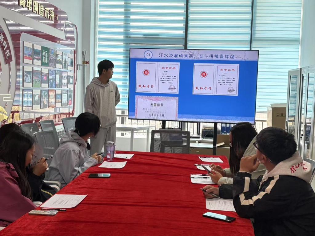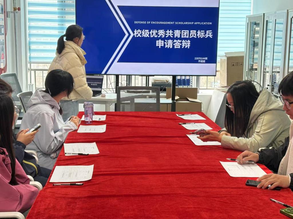 答辩开始后答辩人员按顺序进行答辩。首先进行的是校园十大青年人物的答辩,由韩泽斌同学展示自己的成果,接下来进行的是校级优秀共青团员标兵答辩,由齐妞妞,陈子琦,李哲辉,任亭桦四位同学同学依次进行答辩,后进行的是校级优秀共青团干部标兵的答辩,由王佳昊,姜晓虎两位同学展示自己负责的学生工作及收获感想。