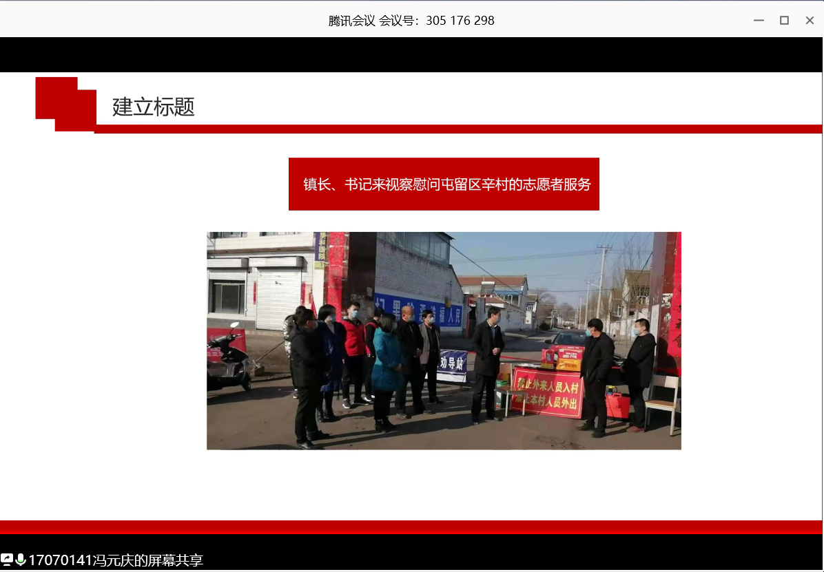第二位分享者是预备党员17070141团支部冯元庆学长,作为预备党员的他积极参加村里登记外来人员和车辆,张贴防疫通告普及防疫知识等志愿活动,期间镇长和书记亲自前来慰问。冯元庆学长按照党员的标准要求着自己,为人民服务,是我们学习的榜样。