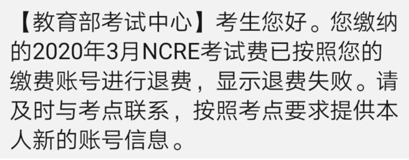 由于新冠疫情原因,2020年3月份全国计算机等级考试没有正常开始,现已开始对原来报名参加考试的考生的退费工作,所有报名参加2020年3月份全国计算机等级考试的考生都应该收到教育部考试中心发的一个短信,退费成功的短信内容为: