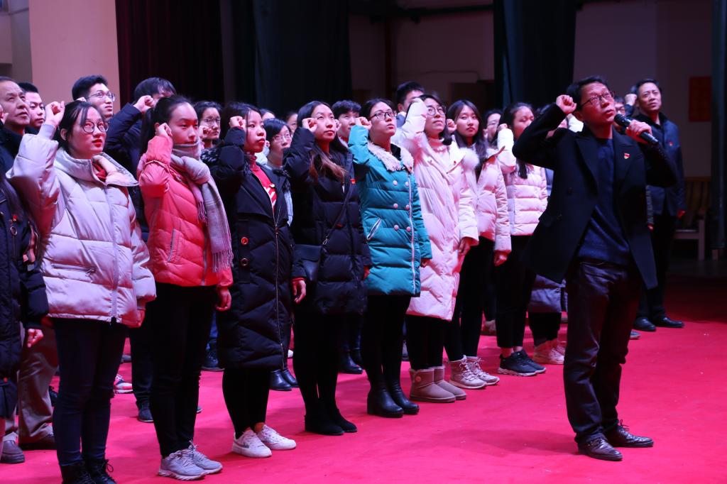 荡气回肠的国际歌后,主持人宣读了30名预备党员名单,党委书记郭书杰为新党员一一授予党徽。随后全体党员佩戴党徽,面向党旗,高举右手,在党委委员梁志剑老师领誓下,新党员庄严宣誓,老党员重温入党誓词。铿锵有力的宣誓声响彻大厅,让现场所有人都深受感染。新老党员代表王鹤霖、党书畅分别发言,表示要恪守入党誓词,不断增强党性修养,充分发挥党员的先锋模范作用。