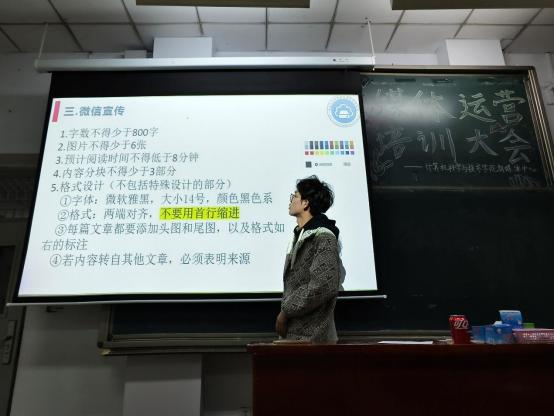 新媒体中心运营部部长李振分享了有效宣传校园活动的方法,学长结合个人经验,在字体、格式以及具体内容上都做了详细介绍并给出了合理化建议,同学们也深刻理解了如何有效宣传。