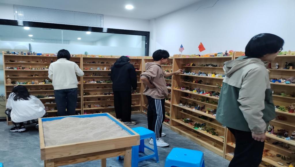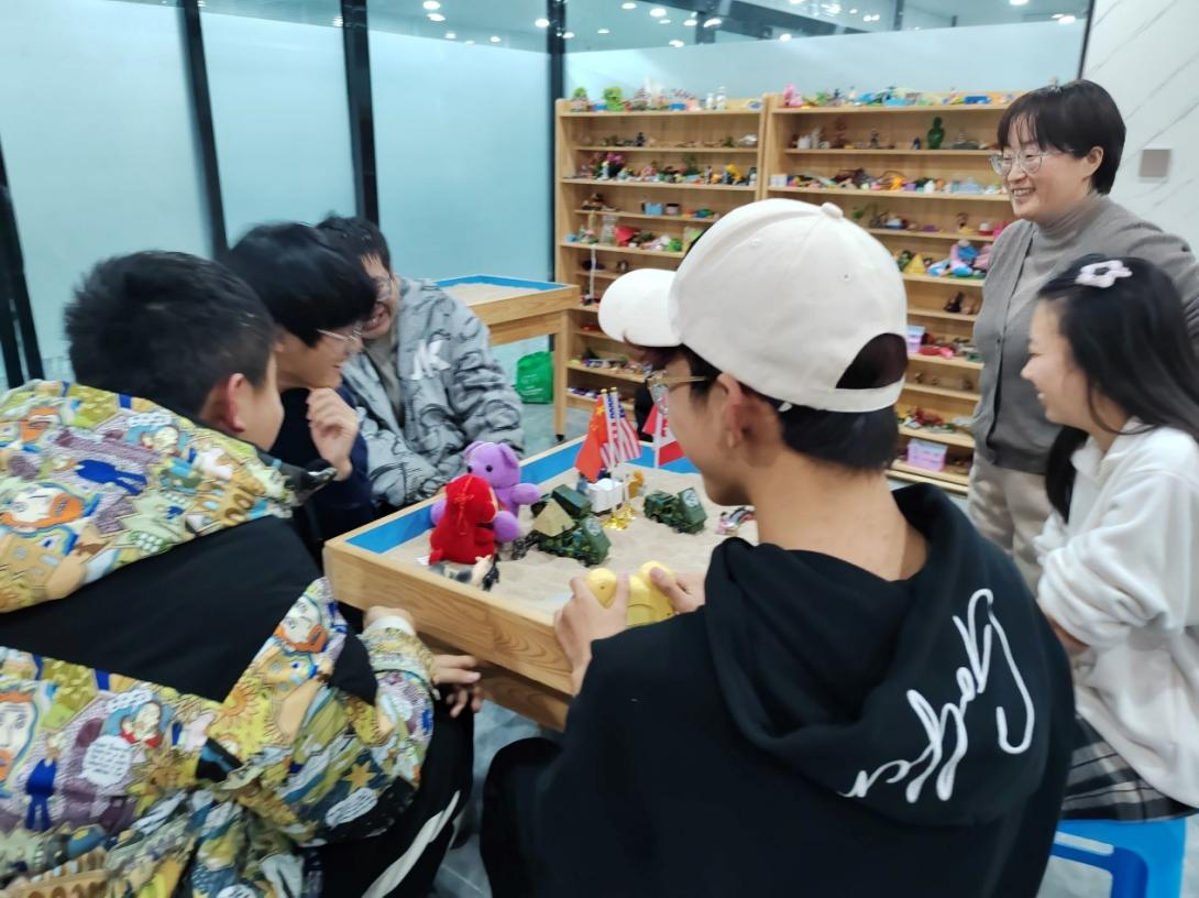 魏春燕老师主持,参与学生通过亲手操作沙盘,构建自己的微型世界,以此来表达内心的想法和情感。在轻松愉快的氛围中,学生们不仅释放了压力,还增进了彼此间的交流与理解。
