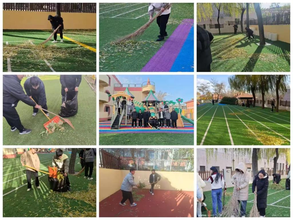 24070143班志愿者走进幼儿园开展落叶清理活动。志愿者们带着扫帚、簸箕等工具,分工有序,迅速投入工作。操场、滑梯旁、小径上,金黄落叶堆积,他们挥动扫帚,所到之处落叶归集,细小角落也用手捡拾,不放过一片。