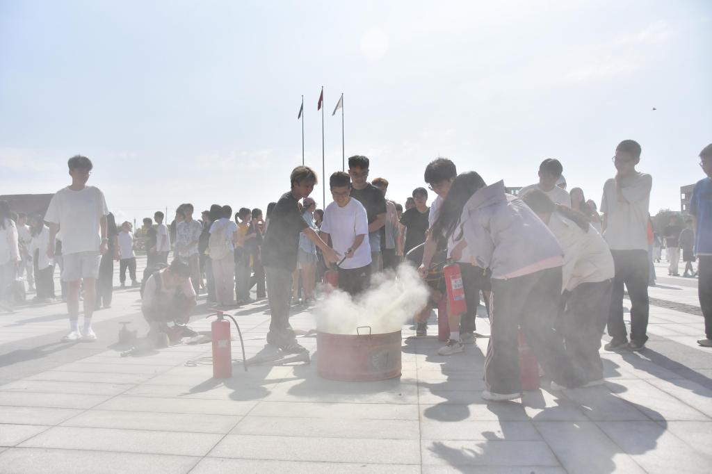 所有人员于东广场集合,在学生会生活部的组织下由于树江同学向同学们讲解了灭火器的使用方法并与其他成员带领学生模拟灭火体验,直观地了解到消防安全知识,提升了消防意识与技能。最后有序引导集合地点的学生安全撤离,并整理现场。